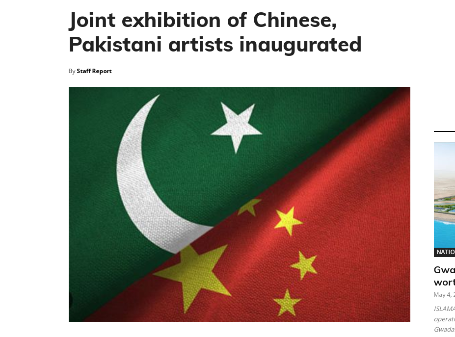 《今日巴基斯坦》4日报道,展览开幕式在拉合尔教育大学主校区举行,来自中国的16位知名艺术家和来自巴基斯坦的2位艺术家参加了此次展览,他们的作品将在展览中展出。